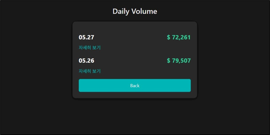 3. 최근 2일간의 거래량이 날짜별로 정리된 테이블로 표시됩니다. 각 토큰의 거래량과 총 USD 가치가 포함됩니다.
